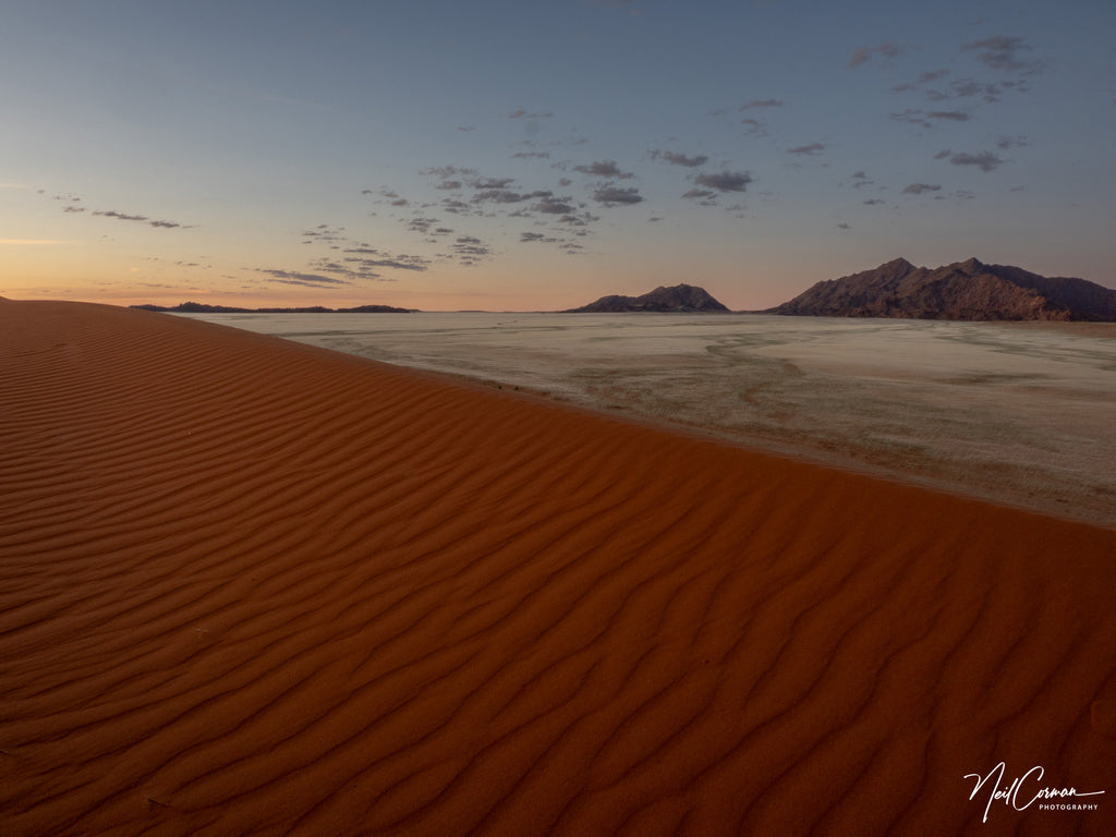 Just before sunset in Namibia I walked up onto a dune to view the landscape of the sand and open land of the country. As the sun started to set I found some sand which had lines leading to the open land of the country and the colors of the sunset I was watching at the end of the day.